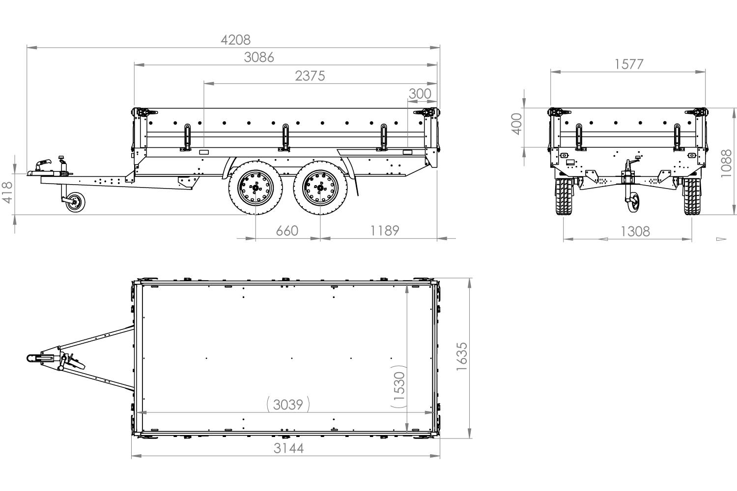- Remorque 2 essieux avec une surface de transport de 304×153 cm. PTAC de 400 à 750 kg. Deux essieux non freinés. Entièrement galvanisé.